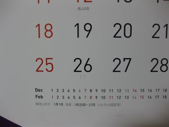 | 1月26日の下に、1/1と書いてあります。韓国の元旦です。このカレンダーは、日本の暦と、韓国の暦の両方がわかるようになっています。 | |