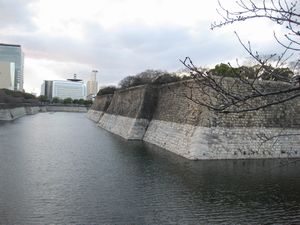 | 道路とお城を隔てるお濠も雄大です。石垣もとても立派。さすが天下の太閤さんのお城です。 |  |