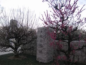 | 大阪城内堀沿いに歩いて梅林の入り口にきました。紅白の姿の良い梅が迎えてくれます。 |  |
