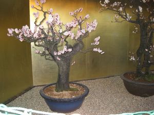| こんな盆梅も展示してありました。太い幹に歴史を感じます。 |  |