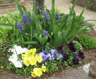 |  午後から雨になるそうです。 今を盛りと咲いている春の花々 美しい姿を留めたくて・・・・・ 寒い冬を越して今も咲き続けるパンジー、そして ヒヤシンス、まもなくチューリップが開きます。 |