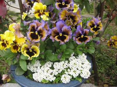 |  ガレージの入り口に、二鉢、置きました。 何とも優雅なパンジーです。アリッサムが引き立て役! |