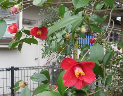 |  我が家の庭のシンボルツリーのつばき 一重の素朴な藪椿は、本当に大好きな花です。 |