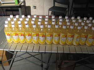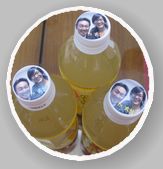 | 「はろーきてぃ日向夏みかんジュース」を会から出席者にプレゼントです。このジュースのキャップにも、shokoちゃんはヨンジュンさんと大村さんのシールを作って貼ってくれました。   |  |