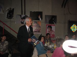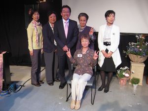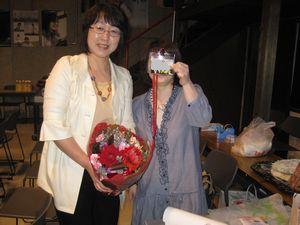 Paddingtonさんは写真のヨンジュンさんにご報告。大勢の皆さんの力で成功裡に終えることが出来てありがとう! 「風の散歩道」の大本さんから提供のお花も会場を盛り上げてくれました。 |  |