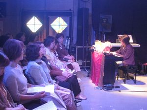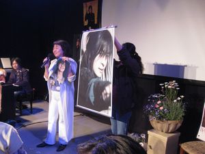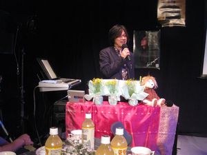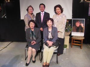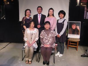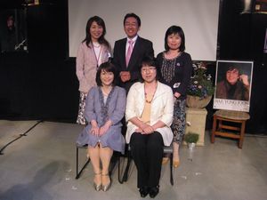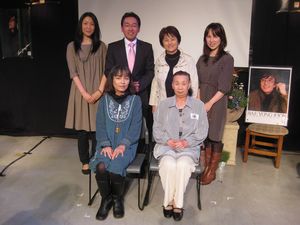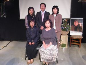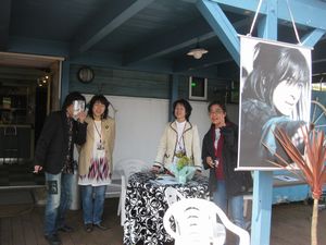 |  | 受付も準備完了です。早くから音出しして下さっていたピアニストの深田宏一さんも一緒にパチリ! 左から深田さん、いつも素敵な笑顔で受付のさっちゃん。ビデオ担当のtakaちゃん、売り場担当のkuroちゃんです。 案内のタムドクは、youyonさんからのプレゼントです。 |