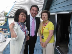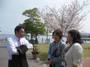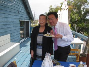 | 今日は本当に素晴らしいお天気です。打ち合わせを終えた大村さんは、外でリラックス。羽田から同じ飛行機で参加して下さったkeikoさんと改めてご挨拶。空港待合ラウンジで挨拶されてびっくりしたと大村さんです。 |  |