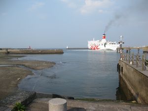 |  | その頃、かんたん倶楽部の前の海は、引き潮で、砂浜が見えています。その向こうを神戸へ向うフェリーが滑ります。 |