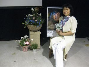 | 正面ステージにはヨンジュンさんにも登場して頂きました(笑)お花は会場お隣の「風の散歩道」さんが置いて下さったイングリッシュガーデンの雰囲気漂う寄せ植えです。 |  |