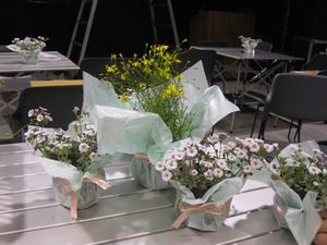 | 今回は、参加者も多いので、会場設定をどうしたら良いか、試行錯誤。素敵なテーブル花の準備も出来ました。ゴールデンシャワーと、グラウンド霞み草です。 |  |