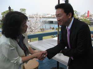 | ようこそ大分へ来て下さいました。ありがとうございます。早速、記念写真です。ピンクのネクタイがお似合いでいつもテレビのニュースキャスターで見ている以上に素敵なダンディ振りです。 |  |