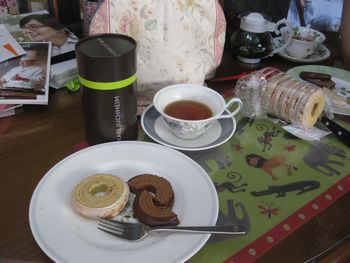 |  | かねてからの約束のバラ摘みの日です。まずはその前にティータイム。先日、東京から来られた共通のお友達のおみやげのバームクーヘンをおいしく頂きました。 紅茶もとってもおいしかったです。 |
