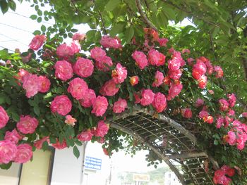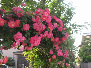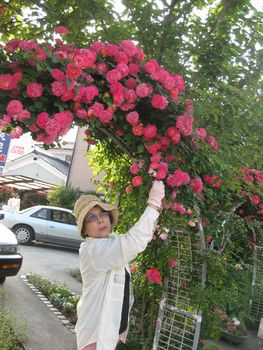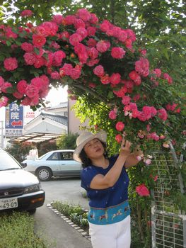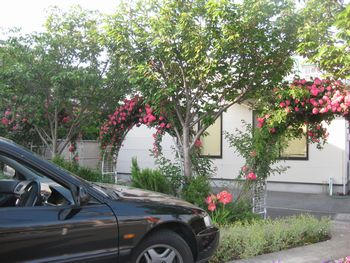 | そして、友人のお姉さんの家のバラ摘みに行きました。バラのアーチが作ってあって、ピンクのバラが一杯咲いています。ちょうど、良い時期でした。 |  |