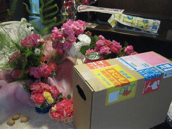 |  | 我が家にも小枝をもらってきて活けました。 花だけのものは、カップや器に浮かべました。 |