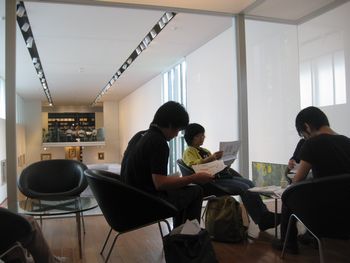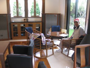 | 喫茶ルームです。大きなスピーカーから美しい音楽が流れ、大きく開かれた窓からは緑が一杯見えます。 ここでおいしいコーヒーとパンで簡単に昼食としました。 |