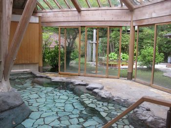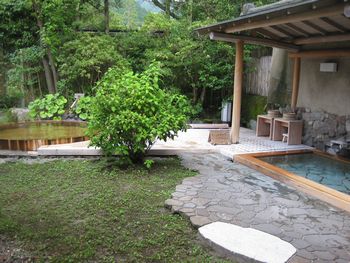 | 露天は緑の木立の中の、丸い大きな桶を利用した温泉です。風が心地よくて、蒸し暑かった日中がうそのようです。 | ![]() |