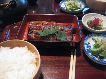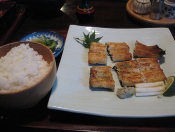 | 土用の丑の日ではないですが、この時期一度は食べておきたいうなぎを頂くことにしました。夫は蒲焼、私は白焼き、ふわっと焼かれたうなぎはとってもおいしかったです。さあ、これで音楽祭も元気で過ごせます! | |