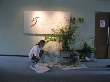 その後、会場の中央公民館へ出かけました。ホール入り口では、久保田さんが、大きな花瓶に高原の花を生けこんでいました。 |
