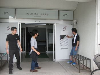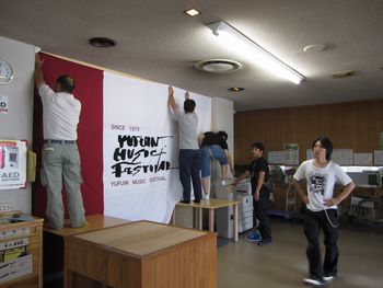 | ロビーも、音楽祭の雰囲気作りをします。由布院の若い人たちが、横断幕や、写真など作りました。 | ![]() |