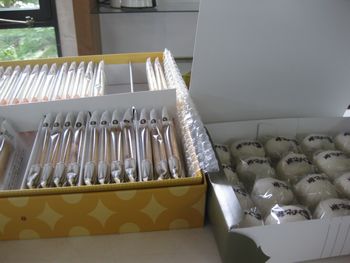 私は喫茶コーナー担当です。昨日、美しく拭きあげて下さったカウンターは、気持ちよくなっています。コーヒーカップを並べて、コーヒーを点ててスタンバイです。 |