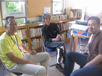 まもなく前夜祭が始まりますが、束の間の、ほっとする時間です。 ゆふいん音楽祭の実行委員長の加藤昌邦さんを真ん中に、毎年、スタッフとして駆けつけて下さる、金沢の澤田さん(右)と広島の松田さんです、 |
