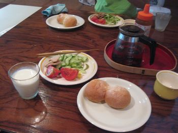 | 簡単な朝食を作って食べます。由布院のお店で買ったきゅうりやトマト、パンです。さあ、今日はもうフィナーレコンサートです。 |  |