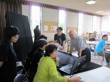 |  | ゆふいん音楽祭で写した写真もたくさんになりました。今日は、PCを会場に持ち込んで、少しでも写真の整理をしたいと思いました。竹井先生が、写真を見せてくださるというので、小林先生までのぞきに来られています。 |