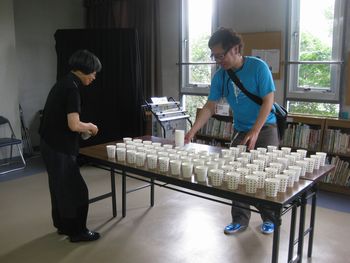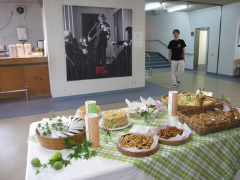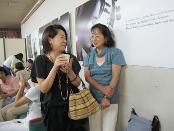 |  | 演奏が終わり、大急ぎで、会場を出ました。ロビーでは、竹井先生はじめ皆さんが、喫茶の準備をして下さっていました。ここは、梅蜜ジュースと、紫蘇ジュースのテーブルです。これだけでは足りないと、またテーブルを持ってきてもらいました。 |