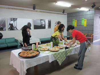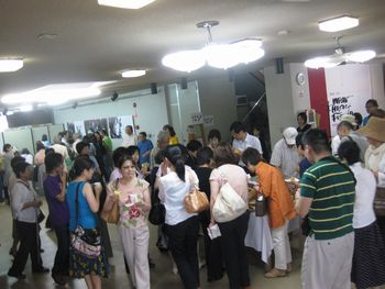| 会場から、お客様が出てこられました。たちまちお菓子のテーブルは人垣で一杯になります。 |  |