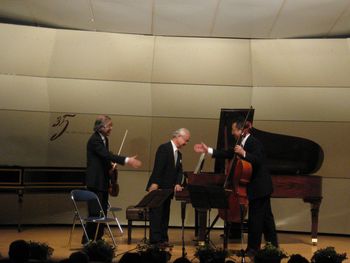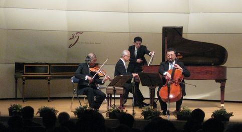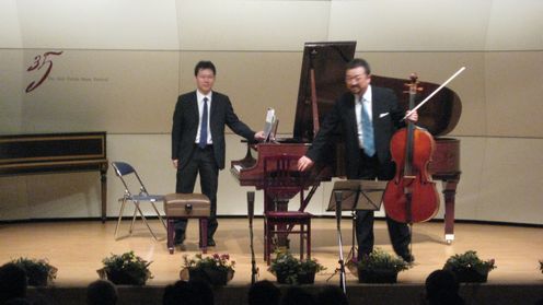 |  | 音楽祭最後のプログラムは、歴代の音楽監督の演奏です。 初代音楽監督の岸部百百雄さんのヴァイオリン、3代目音楽監督の河野文昭さんのチェロ、そして、現在の音楽監督の小林道夫さんのピアノです。二代目の黒沼俊夫さんは残念ながら故人となられています。 |