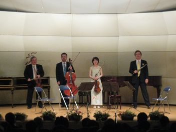 | てんてこ舞いの忙しいティータイムが終わりました。大体の片づけを終えて、会場に入れてもらいました。 第二部、W..A.モーツァルト オーボエ四重奏曲 ヘ長調 K.370の演奏の終わった所でした。左から、ヴィオラの川崎和憲さん、チェロの河野文昭さん、ヴァイオリンの玉井菜採さん、オーボエの小林裕さんです。 |  |
