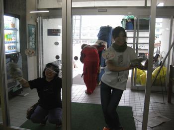 | お客様をお送りして、スタッフは、会場片付けをテキパキとしました。借りる前より、美しくしてお返ししましょう、と声を掛け合ってお掃除をしました。窓ガラスをふきあげるスタッフです。 |  |
