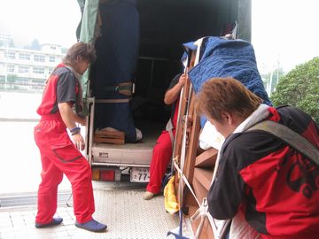 |  | 演奏会で美しい音色を奏でてくれた、ピアノが、帰って行きます。貴重なピアノの運搬はプロの手によって、慎重に進められました。 喫茶コーナーも、カップや道具をしまいました。そして、ロビー全体も、元の公民館に戻しました。お疲れ様でした。さあ、フェアウエルパーティへ行きましょう。 |