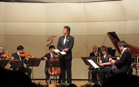 |  フィナーレコンサートが始まりました。先ずは、J.S.バッハのカンタータ第56番、「われは喜びて十字架を負わん」 左からヴァイオリンの花崎淳生さん、ヴィオラの桐山建志さん、チェロの花崎薫さん、バリトンの三原剛さん、ピアノの小林道夫さん、オーボエの工藤亜紀子さん、同じく小林裕さん、他には、写っていませんがオーボエの木村奈津実さん、ヴァイオリンの蒲生克郷さん、がいらっしゃいます。 | |