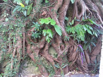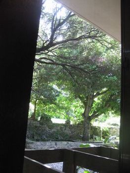 |  | レストランの入り口の石垣にはこんな根っこが出ていました。上に目をやるとさわさわと木陰を作る大樹になってました。 |