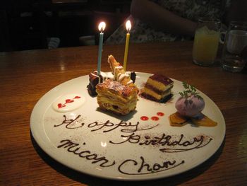 |  | こちらはお隣のテーブルの若い女性にとお店が作られたデザートプレート。お一人が誕生日なんだそうです。 うれしいですね。こんなおもてなしは。 |