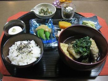 |  | 素朴で、でも、心と手が十分に注がれて、体にも本当に良いな、と思うお料理です。 手前右は「ソーキ(あばら)汁)水色のガラス皿にはへちまの酢味噌和えにスーチカー(豚の塩漬け写ってないです)小鉢は、左がジーマミー(ピーナッツ豆腐)、ゴーヤの白和え、もずく、セロリときゅうりのピクルス |