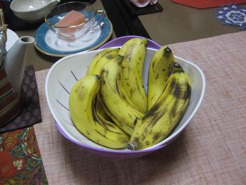 |  | デザートはピンク色をしたガアバのゼリーにドラゴンフルーツ そして写真は島バナナ、小さいけれど、黒点も出ているけれど、それがとってもおいしんだそうです。 |