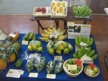 |  | ホテルのロビーで朝市が開かれていました。 昨夜の食材も売ってました。 左上からドラゴンフルーツ、パパイヤ、島バナナ 下段左からグアバ(多分)へちま、バナナです。手前の袋に入った小さな緑の玉がシークァーサーです。 |