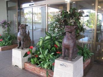 |  | ホテルへ連れてきてもらいました。 入り口には、シーサーが睨んでいますが、愛嬌があって、可愛い顔をしています。 |