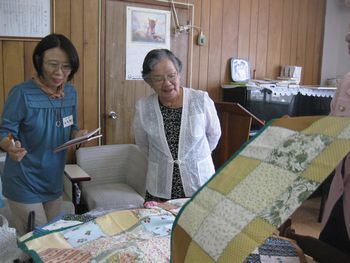 |  | 閉会のあとも、皆さんとのお話がとても楽しかったです。 城間さんがこの夏に作られた、端布を継いだひざかけが余りにも見事で、広げて見せて頂きました。 |