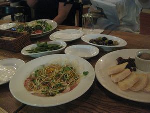 | どれも大好きなお料理です。たいのカルパッチョ、自家製レバーパティ、シーザースサラダ、オリーブ色々、 | ![]() |