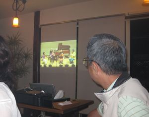 | スクリーンでは、音楽祭記録?ツネちゃんの写したたくさんの記録写真がスライドで出てきます。思い出一杯です。 | ![]() |