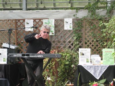 | 軽快なメロディーはとっても心浮き立ちます。 カメラを構えると、いつもVサイン 歌は、懐かしいポップスの数々、 お客様は、手拍子で聞かれています。 |  |
