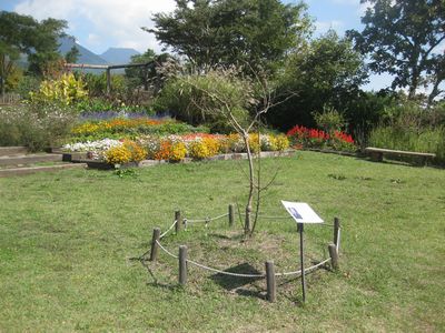 | その林を抜けると、芝生の小さなサークルに、その真ん中にはひょろろんとした木が1本、何だかとっても大事そうに植えられています。 何でしょう・・・・ |  |