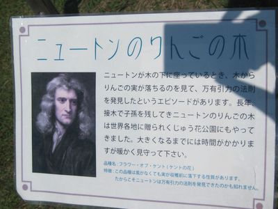 |  | 曰くありげです。それもその筈、「ニュートンのりんごの木」です。実ったりんごが落ちるのを見て、万有引力の法則を発見したニュートンさん。 そのりんごの木を接木で育ててきて、世界各地に~~~その1本がここにあります。りんごが実るのは何年後かしら? フラワー・オブ・ケント(ケントの花)この木に実るりんごは風がなくても収穫前に実が落ちることがあるそうです。だからニュートンさんは万有引力の法則を発見出来たのかもしれないです。(看板より) |