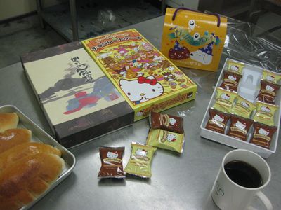 | 今日のおやつのご紹介です。レストランのスタッフからの差し入れ鹿児島のかるかん、大分のハーモニーランドのキティちゃんケーキそして、私も、お友達に頂いたサブレを持ってきて、スタッフに差し入れ。左端にちょこっと写っているのは、シナモンコッペです。ちょっと形が悪くて、売り場には出せなくて、、、私たちの試食用にまわしました・・・・ |  |