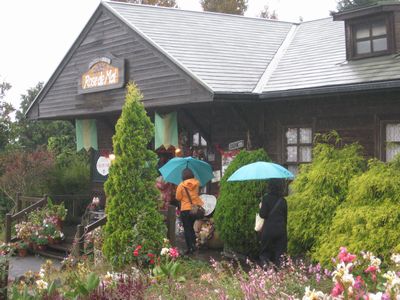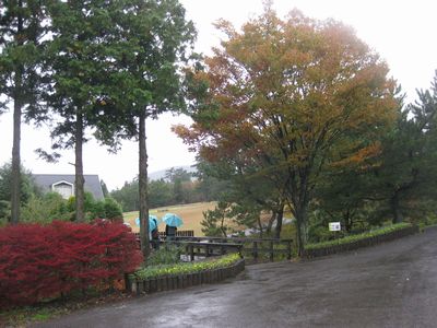 |  | 25日 わが家を出る時は、曇り空だったのに、久住高原に近づくに連れて、雨になりました。くじゅう花公園に着くと、冷たい冷たい雨でした。用心して車に積み込んできたアノラックを着て花公園に入りました。晩秋の日曜日、冷たい雨の日曜日になってしまいました。 木立の中や、お花の見える近くに置かれたテーブルや椅子も雨に濡れています。折角、訪れてくださった方々も、寒さに背をかがめて歩かれていて、ア~ア、残念です。温室を利用した「こもれびカフェ」の中は、恒例のコンサートが終わり、多くの方が寛がれています。とっても素敵な光景だな~と思いました。