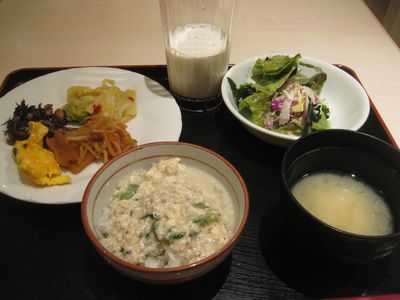 |  24日、ホテルでのサービスの朝食です。宮崎の郷土食との言葉に釣られて「冷汁ひやじる」にしました。後で聞いたらこれは夏のメニューだから、冷たかったでしょう?と言われてしまった。折角の温かいご飯に冷たい汁をかけるので、、、ちょっと寒かったです。で、急いで味噌汁を飲みました。豆乳味噌汁ですって、ちょっと変わった味!それに、牛乳にコーヒー、ちょっと変な取り合わせになってしまいました。 |