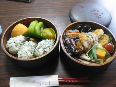|   昼食は、お友達が手作りのお弁当を用意して下さいました。とっても豪華で、おいしくて、食べ切れませんでした。左はしその入ったおにぎりと、フルーツ(柿にキーウイ)そして栗の甘露煮右はおかずが一杯です、何種類入っているでしょう?本当にごちそうさまでした。 |